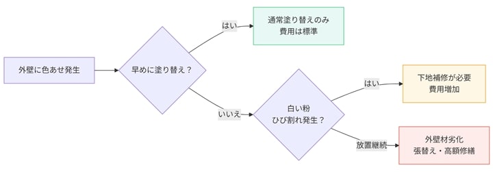 外壁の色あせは軽視されがちですが、放置期間によって塗り替え費用や工事規模が大きく変わります。